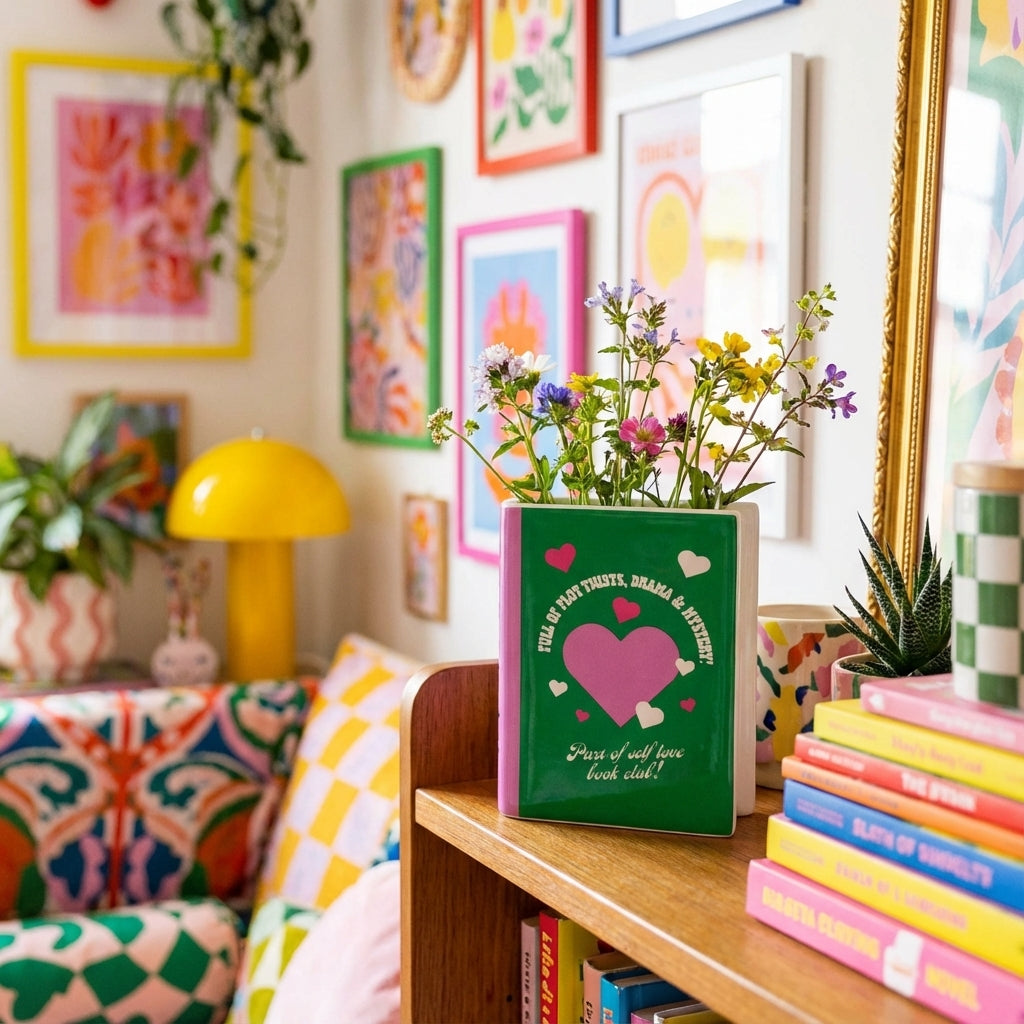 Oubliez les vases classiques : celui-ci se déguise en roman de librairie, prêt à trôner fièrement sur votre table basse. Avec ses couleurs rose bonbon et vert pop, ses petits cœurs et son look de best-seller de l’amour, il transforme instantanément votre intérieur en scène de comédie romantique (où VOUS êtes le personnage principal 💁♀️).